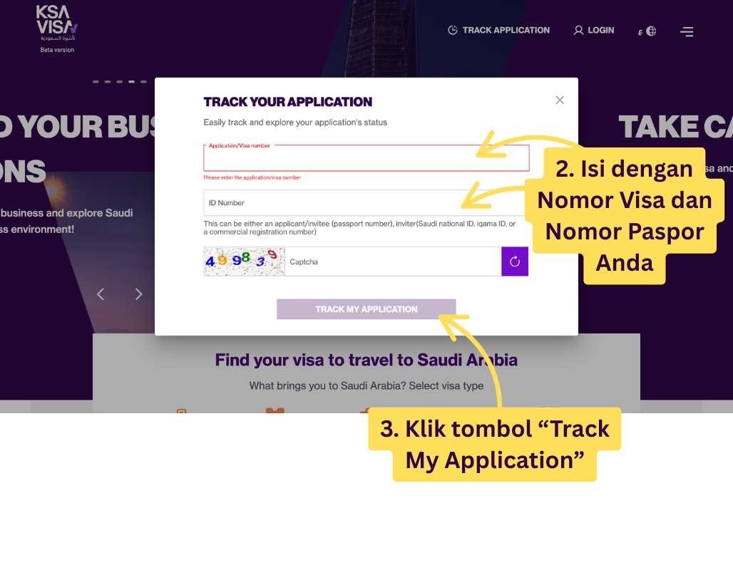 2. Akses ke alamat website ksavisa.sa, maka akan membuka halaman dengan tampilan sebagai berikut, kemudian klik menu Track Application. (perhatikan dengan benar, alamat domain urlnya adalah ksavisa.sa, selain itu perlu diwaspadai bukan alamat yang resmi)